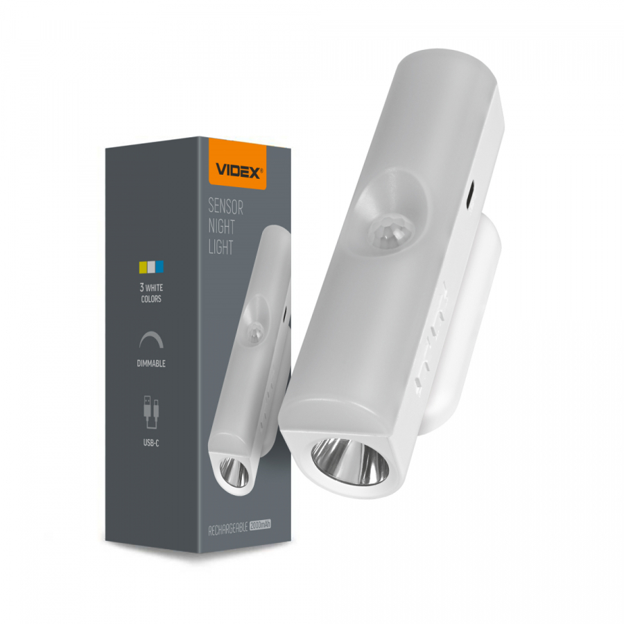 A VIDEX VL-NL108W mozgásérzékelős LED újratölthető éjszakai fény lakóterek, gardróbok, könyvespolcok és egyéb területek helyi megvilágítására szolgál. A beépített érzékelő segítségével automatikusan képes megvilágítani egy adott területet a mozgás érzékelésével. Két fényforrással rendelkezik: egy elülső, nagy hatótávolságú fénnyel, amely zseblámpaként használható, és egy oldalsó, rövid hatótávolságú fénnyel, amely éjszakai fényként használható. Az elülső lámpa több üzemmóddal rendelkezik: Magas, Közepes, Alacsony és SOS. Ez a modell lehetővé teszi az oldalsó lámpa színhőmérsékletének (3000K–4000K–6500K) módosítását, valamint mindkét fényforrás fényerejének beállítását. A lámpa könnyen felszerelhető mind fém, mind nem fém felületekre.