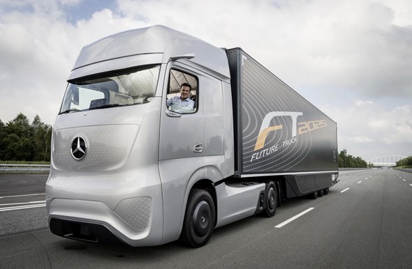 A Mercedes Future Truck 2025 egy prototípus, amely a futurisztikus külsőn kívül rengeteg technikai innovációt kínál, a kabinja pedig leginkább egy minimalista stílusban berendezett irodára hasonlít, mintsem egy kamion belsejére.