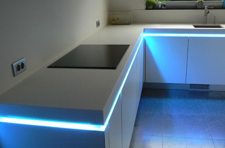 A másik divatos megoldás, a bútorok alulról történő megvilágítása, ha pedig konyhasziget is van a lakásban a végeredmény biztos lenyűgöző lesz. Ennél a variációnál szintén lehet szpotokat és LED szalagot is használni, ezek kombinációja pedig egészen egyedi végeredményt nyújt.