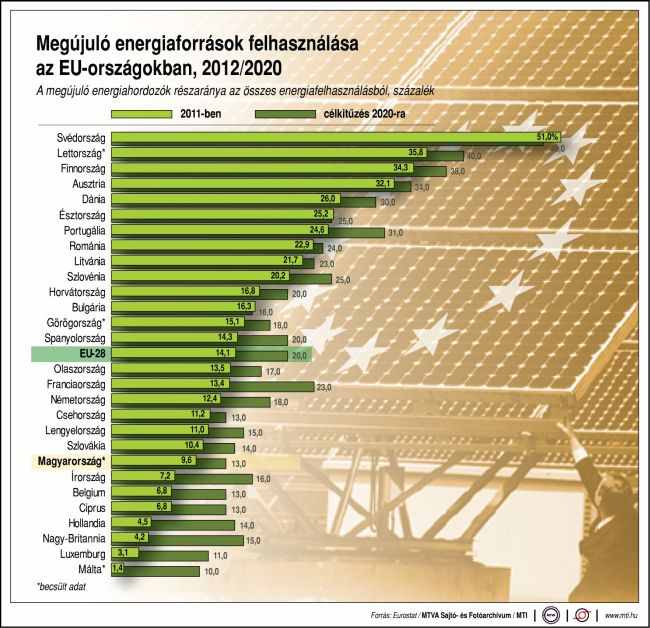 A megújuló energiaforrások felhasználásában a 2011-es adatok szerint Svédország vezeti a listát, de az élmezőnyben található Lettország és Finnország mellett Ausztria, valamint a 8. helyen Románia is. Magyarország csak a 21. helyen szerepel.