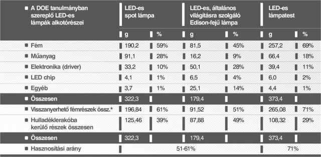 Az Egyesült Államok Energiaügyi Minisztériuma (DOE) egy három részből álló tanulmányt készített, hogy értékelje a teljes életciklus hatását a LED retrofit lámpák (Edison-fejű, a hagyományos izzókkal csereszabatos LED-es lámpák) és a LED-es lámpatestek vonatkozásában. Az életciklus-elemzés (LCA) szerint nem csak a használat, hanem magának a terméknek a legyártása, szállítása és ártalmatlanítása során is sokkal kedvezőbb a környezetre gyakorolt hatás, mint az eddig használt fényforrások esetén. A DOE tanulmányban szereplő LED-es lámpák közül 3 típust kiválasztottunk, és kiszámítottuk, hogy mennyi hasznos (újrahasznosítható) anyagot tudunk belőlük visszanyerni (1. táblázat).