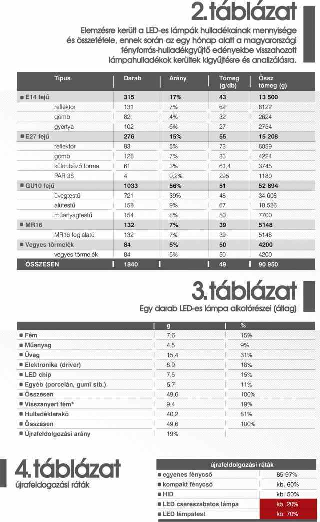 Összeségében azt állapíthatjuk meg, hogy 2014-ben a magyar lámpahulladék-begyűjtő edényekben a LED-es fényforrások közül még csak a LED-es csereszabatos lámpák vannak jelen. A kiégett LED-es lámpákon nincs gyártási idő feltüntetve, így azok élettartamára nézve még csak becsléseket sem tudunk adni. Ami viszont tény, hogy a visszajövő LED-es lámpa hulladék fémtartalma rendkívül alacsony, így a lámpák újrahasznosítási foka is alacsony, csupán 19%, messze alacsonyabb a fent idézett amerikai DOE tanulmány LED-es lámpáinak összetételéből számított 51-71%-os újrahasznosítási rátáinál!