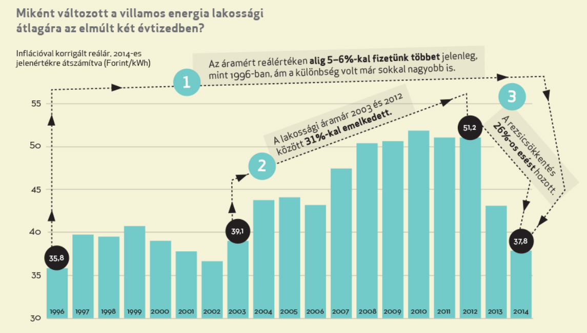 - 1995 és 2014 között a háztartási villamosenergia-árak Lengyelországban 237%-kal, Csehországban 280%-kal, Szlovákiában 378%-kal, Magyarországon pedig 414%-kal nőttek (az inflációt figyelmen kívül hagyva);