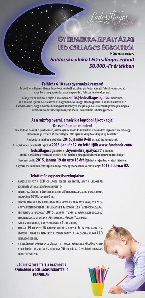 Ha neked vagy valamelyik ismerősödnek van 4-10 év közötti gyermeke, akkor ezt a lehetőséget ne hagyjátok ki! Csupán annyi a dolgod, hogy engedd hadd bontakozzon ki apróságod fantáziája. Nálunk ugyanis gyermeked egy rajza most 50.000 forint értékű lenyűgöző ajándékot ér!