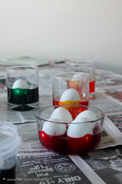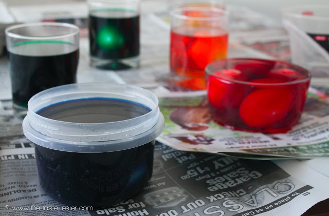 A tojásfestéket elkészítjük a leírás alapján, a kemény tojásokat beleállítjuk a mini tálkáinkba. 10-15 percenként töltjük fel a tálat, 4 adagra osztva.