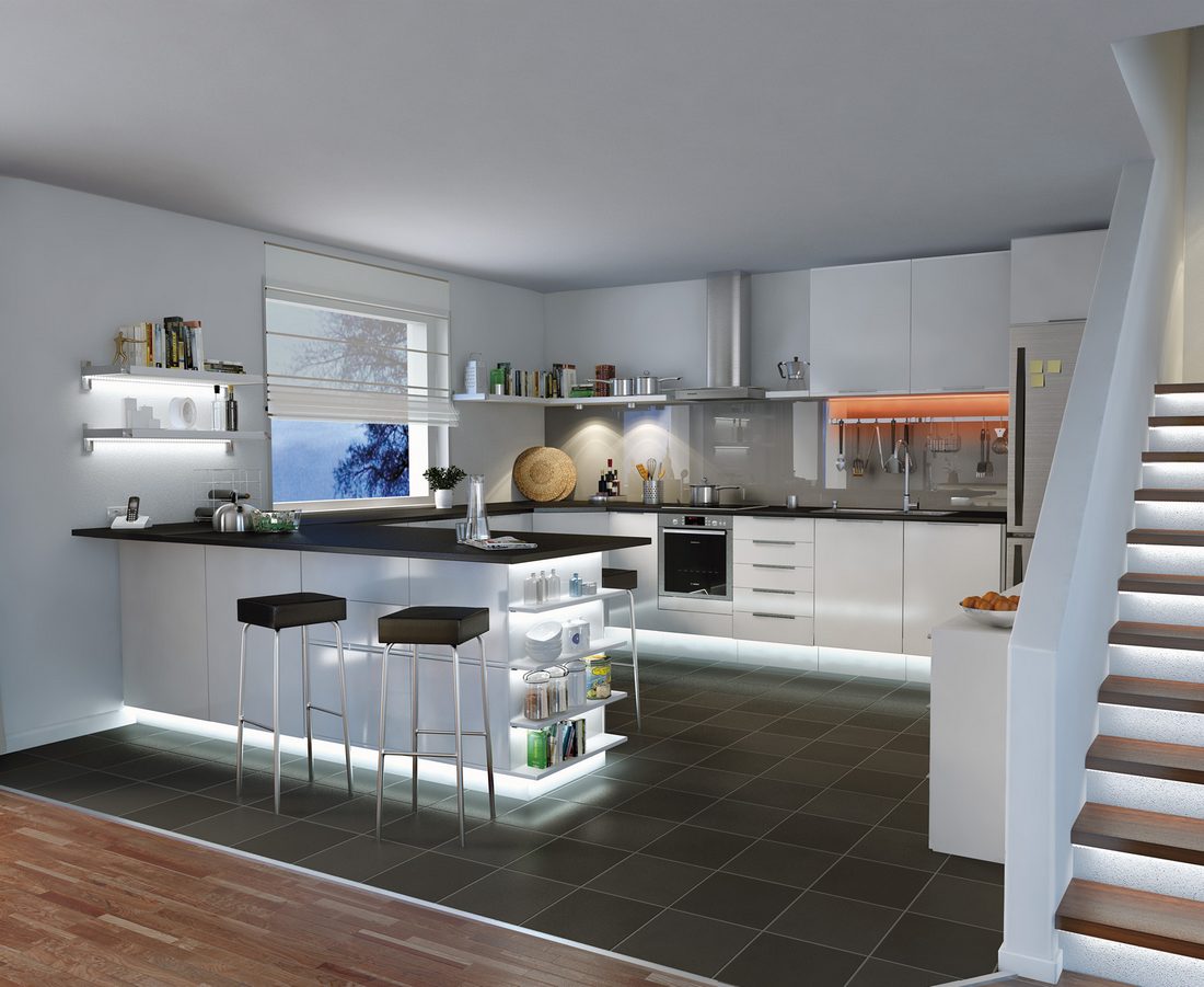 Csak egy tipp. A konyhaszekrény alatt futó LED-szalag a főzés minden fázisában segítséget nyújt. Egyenletes, tiszta megvilágítást kapnak a főzőlapok, a mosogató és az előkészítő asztal. Mindezt úgy, hogy a LED-ek gyakorlatilag nem foglalnak el helyet, sem asztalon, sem falon.