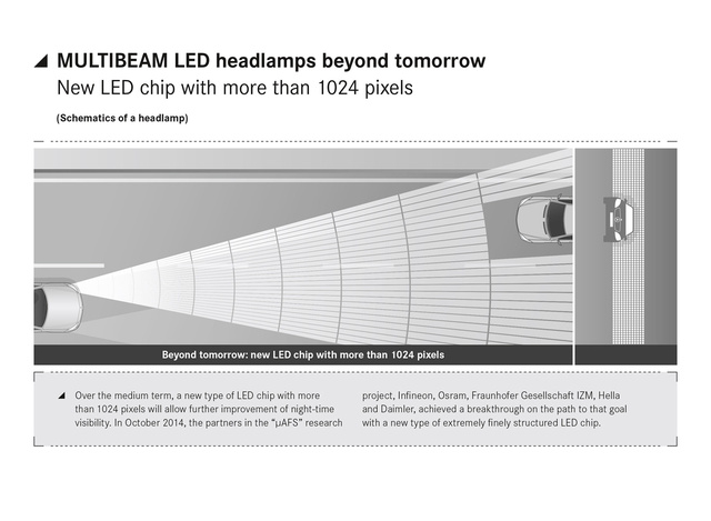 Felépítéséből adódóan a fényszóró annál pontosabban tudja körbeölelni fénnyel a többi közlekedőt, minél több ledből áll, vagyis logikus lépés a szaporításuk. A Mercedesnél jelenleg a 84 ledes fényszórón dolgoznak, de fejben már jóval messzebb járnak. Azt állítják, a közeljövőben akár 1024-ig növelhetik a felbontást, amit ugyanúgy a minőség mérőszámának tekintenek, mint a megapixeleket a digitális fényképezőgépeknél.