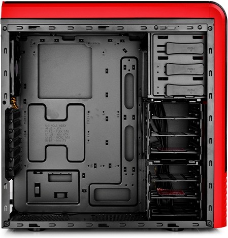 Az alaplaptálca szerelőablakkal, illetve kábelmenedzsmentet segítő kivágásokkal érkezik, tetején pedig Mini-ITX, microATX vagy ATX formátumú alaplap kaphat helyet. A ház három darab 5,25 hüvelykes bővítőhelyet kínál, a 2,5 hüvelykes és 3,5 hüvelykes meghajtókat pedig összesen hat fiók fogadja, amelyek két hármas csoportra vannak osztva, és természetesen könnyedén ki is vehetőek.