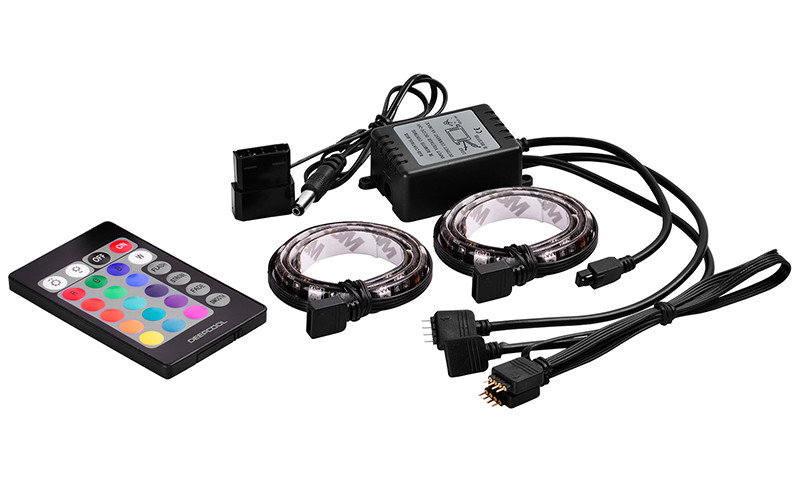 Extraként többszínű LED-szalag is jár a termékhez, méghozzá rögtön kettő. Az RGB LED szalagok egy MOLEX tápcsatlakozón keresztül kapják az áramot, egy vezérlőegységen keresztül, ami infra vevőt is tartalmaz, ugyanis a szett színe a mellékelt távirányítóval változtatható. A távirányító alapján a LED-es világítás fényereje is könnyedén módosítható, sőt, különböző effektekkel még változatosabbá tehető a világítás működése. Az RGB LED szalagok 3M ragasztócsíkkal rögzíthetőek a kiválasztott helyekre.