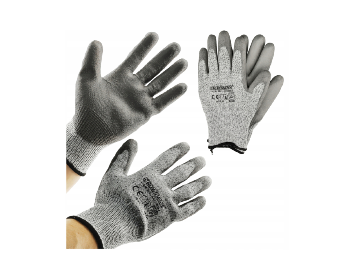 Védelem : Nagy szilárdságú polietilénből és üvegszálból készült, PU bevonatú, túlfeszültség-gátló kesztyűk, 5-ös szintű vágásvédelmet biztosítva (CE EN388 tanúsítvánnyal).