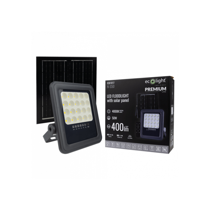 EcoLight 50W-os napelemes reflektor, 4000K, beépített alkonykapcsolóval
