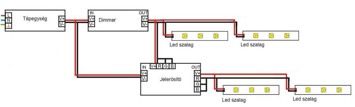 Egyszínű LED szalag összekötés LED dimmerrel, jelerősítővel (2*7 méter LED szalag esetén)