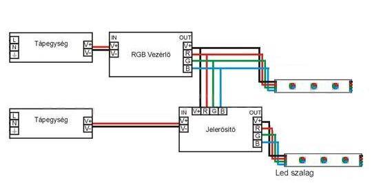RGB vezérlő összekötése jelerősítővel és tápegységgel