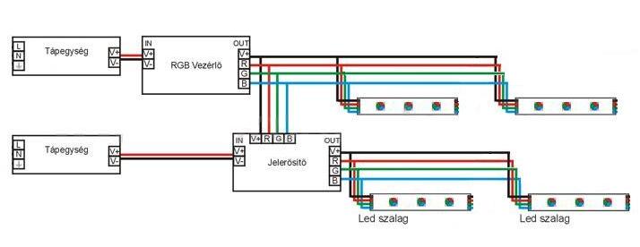 2*7 méter RGB LED szalag bekötése, vezérlővel és jelerősítővel: